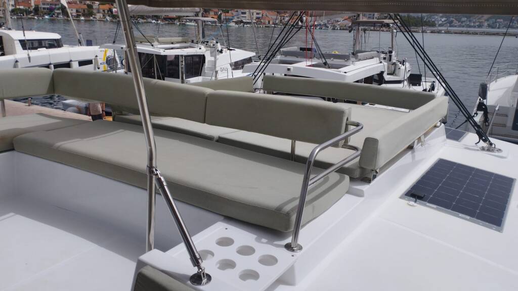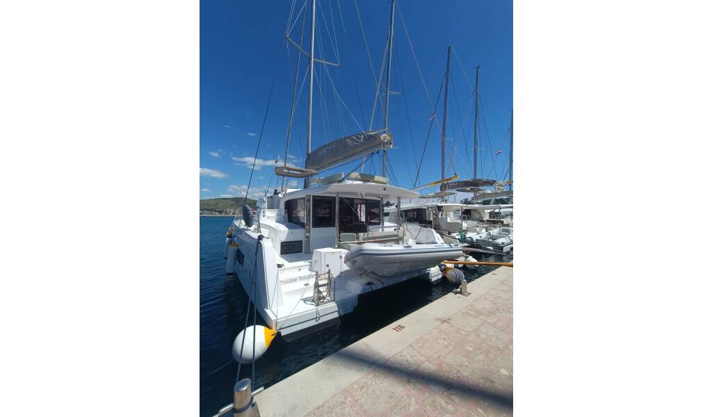 Katamaran Bali 4.4 Double Trouble, izgrađena 2024, matična luka je Marina Frapa, Rogoznica, Šibenska regija, Hrvatska. Ima 4 + 2 kabina, može primiti 8 + 2 + 2 gostiju i ima 4 WC-a.