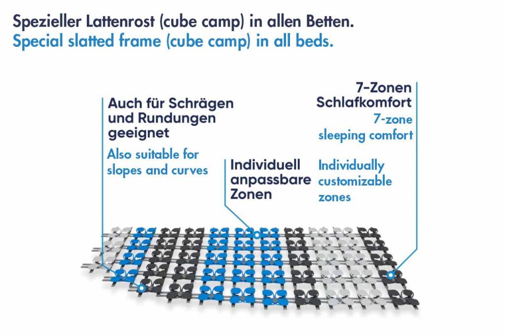 Special slatted frame (cube camp) in all beds.