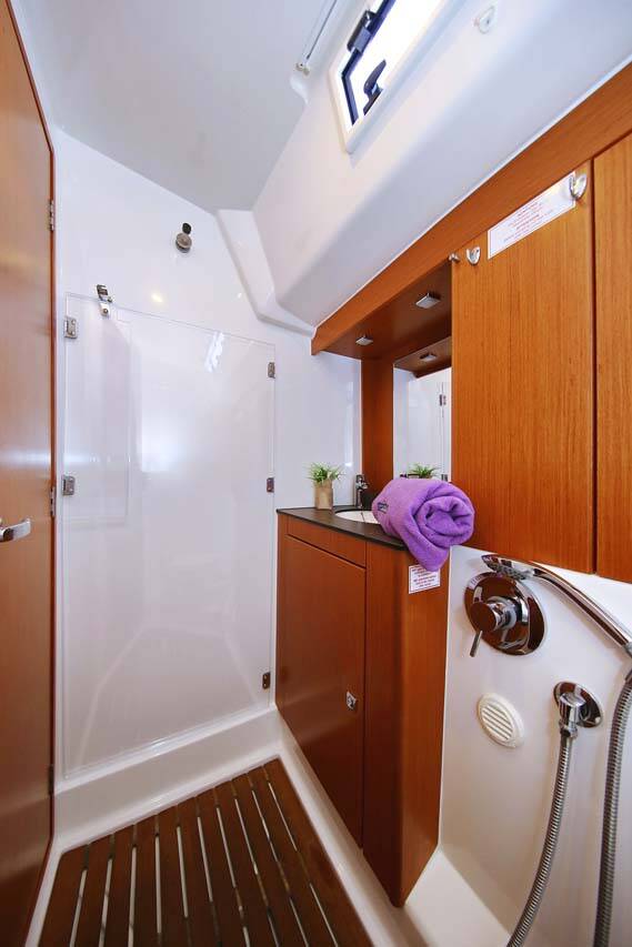 Jedrilica Bavaria Cruiser 56 Mandy, izgrađena 2014, matična luka je Marina Hramina, Murter, Šibenska regija, Hrvatska. Ima 5 + 1 kabina, može primiti 10 + 1 + 1 gostiju i ima 3 WC-a.