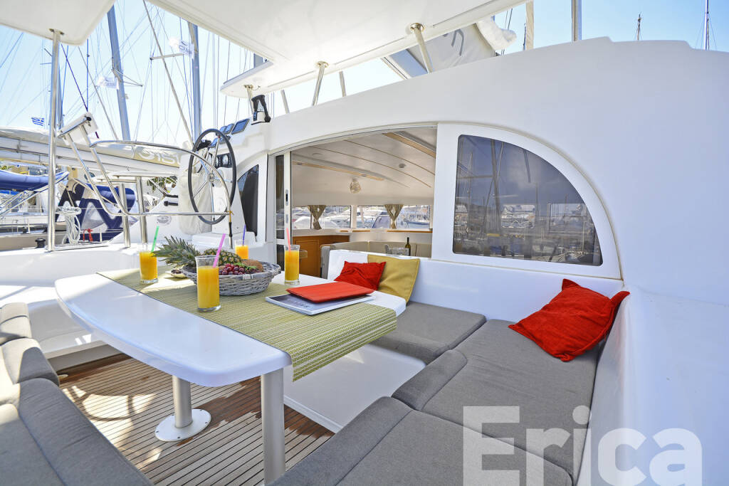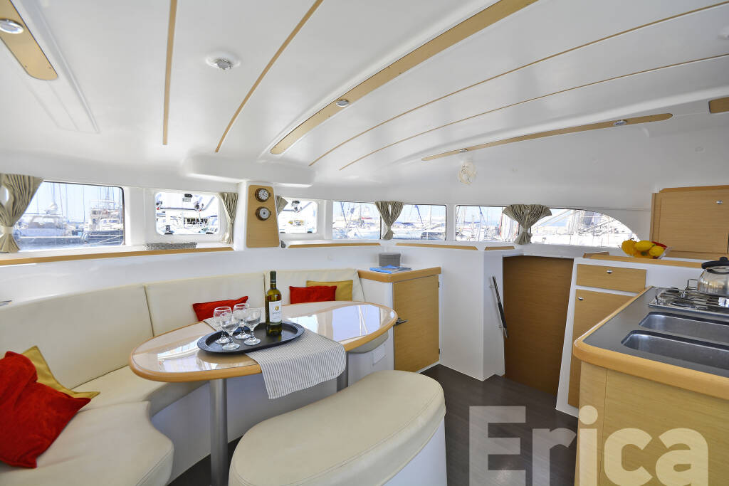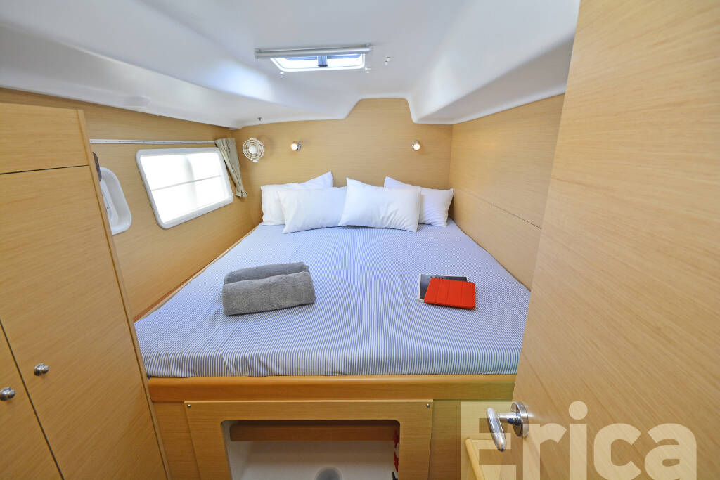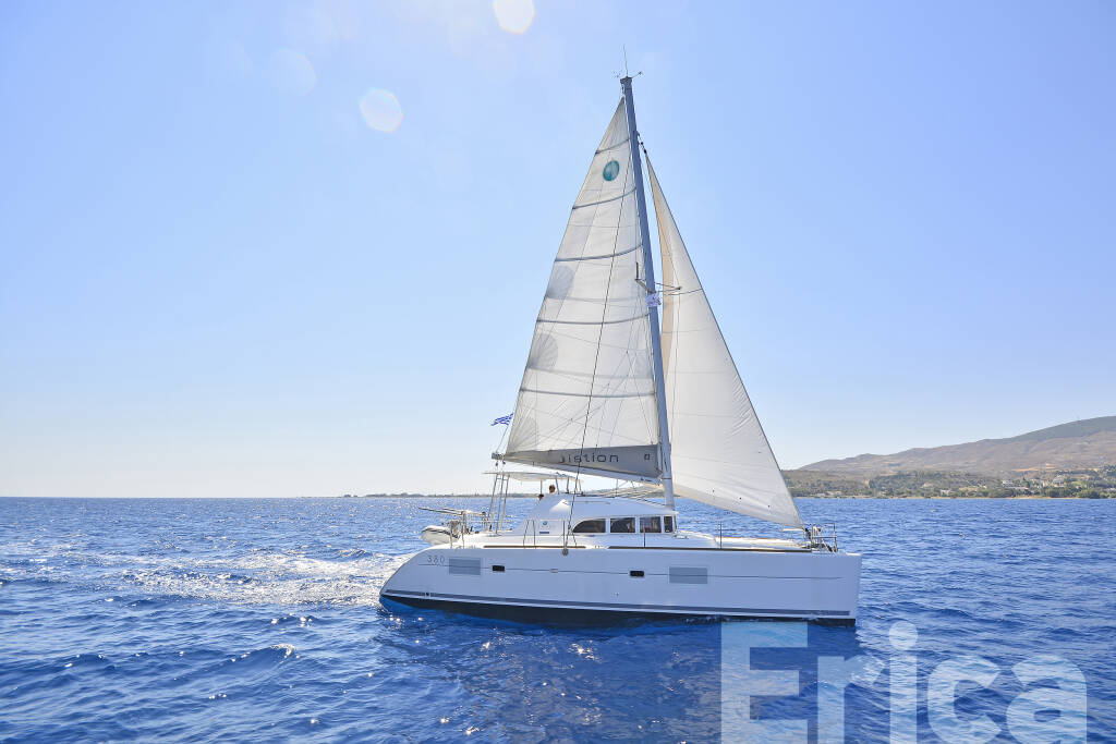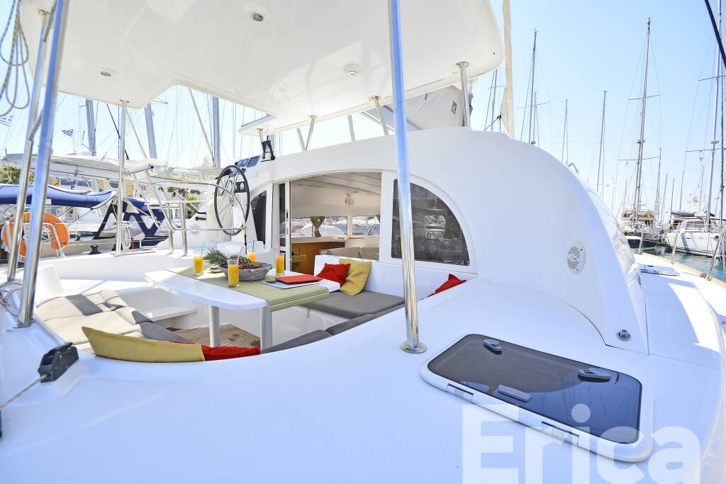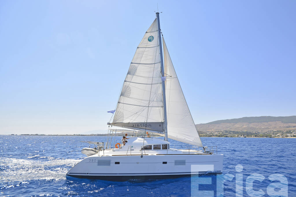 Katamaran Lagoon 380 S2 Erica, izgrađena 2014, matična luka je Kos, Kos Marina, Dodecanese, Grčka. Ima 4 + 2 kabina, može primiti 8 + 2 gostiju i ima 2 WC-a.