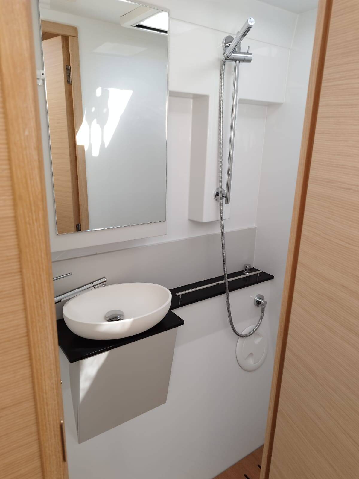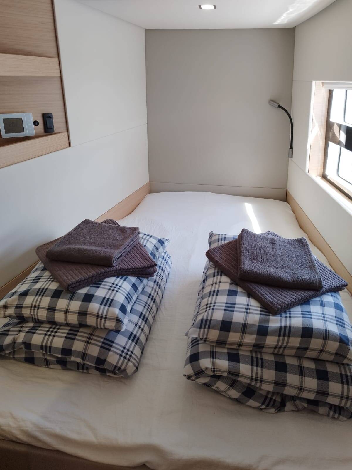 Tuš u kokpitu topla/hladna voda, sjedala za propovjedaonicu od tikovine, utičnice od 230 V u svim kabinama - salonu i kuhinji, komarnici za sva grotla na palubi, sklopivi propeler s 3 lopatice, pramčani sprit, oprema gennaker s Dynema halyardom, električni Vitlo (glavni jarbol), električno sidreno vitlo s daljinskim upravljanjem i brojačem lanaca na kormilu, sintetička tikovina u kokpitu i krmenim platformama, salon na prednjoj palubi: bar/pretinac za odlaganje s integriranim držačima za čaše, sklopivi trodijelni jastuci - koji se mogu pretvoriti u dnevni boravak . Potpuna nadstrešnica kokpita s vratima (grijana), bimini na svakom upravljačkom mjestu, stol u kokpitu: preklopiv u prostor za sjedenje (jastuci uključeni), stol u kokpitu s tikovinom za 10 osoba (1,73m X 0,79m), hladnjak u kokpitu 65L, rolete za prozore kabine, salon -Stol za blagovanje koji se pretvara u lounge krevet (uključujući jastuke), zamrzivač 55L, grijanje (izlaz u svim kabinama, WC, salon i kokpit), inverter 2000W, indirektna rasvjeta u salonu - u kokpitu i krmenoj palubi , solarni paneli 4 x 180 W, sidreni lanac Ø 10 mm - dužina 70 m, FUSION audio sustav Apollo RA770 sa 4 zvučnika, hladnjak 130 litara u kuhinji, plinski štednjak s 3 plamenika, plinski roštilj u kokpitu, skeniranje naprijed (sonar) , highfield gumenjak (RIB) 3.1m sa vanbrodskim motorom Honda 10hp, sohama i bitvama za gumenjak