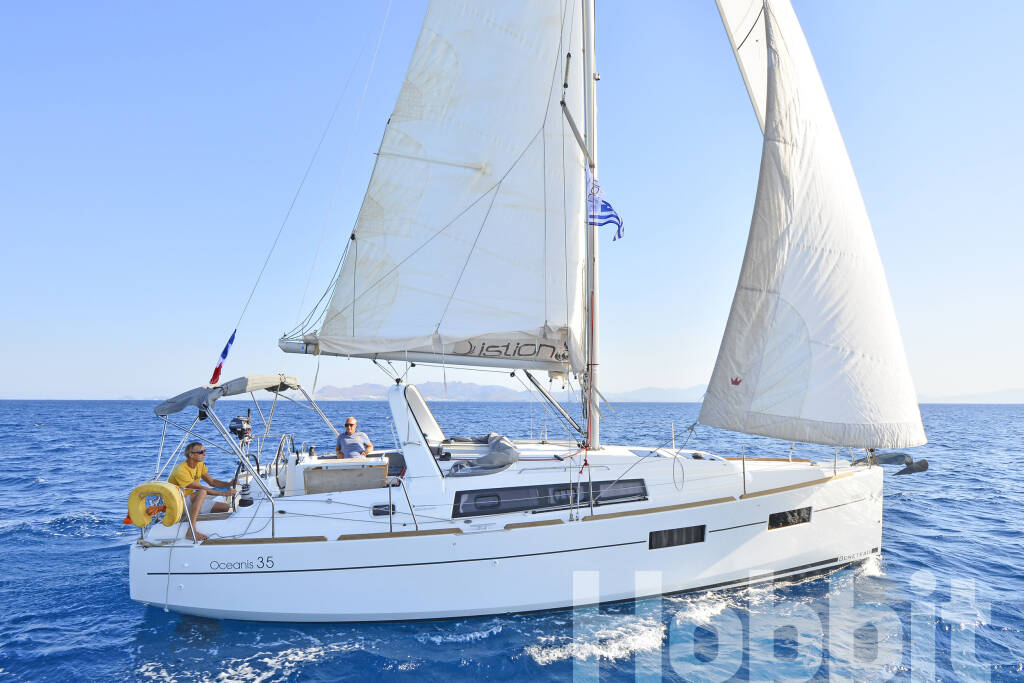 Jedrilica Oceanis 35 Hobbit, izgrađena 2015, matična luka je Kos, Kos Marina, Dodecanese, Grčka. Ima 3 kabina, može primiti 6 + 2 gostiju i ima 1 WC-a.
