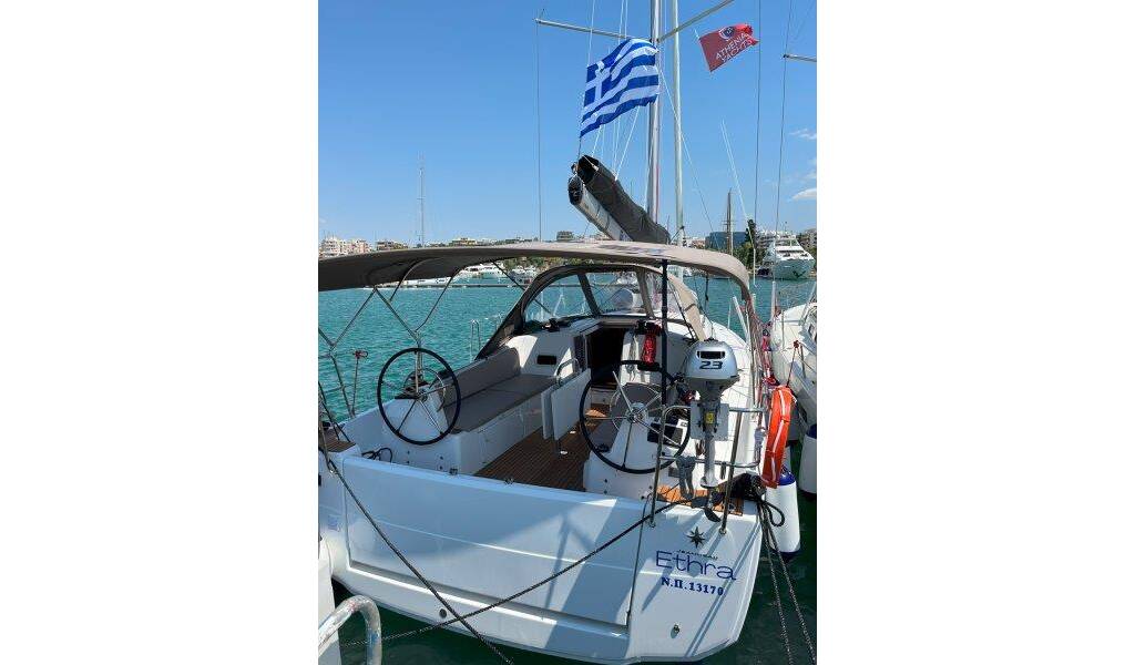Jedrilica Sun Odyssey 380 Ethra, izgrađena 2022, matična luka je Lavrion, main port, Athens area/Saronic/Peloponese, Grčka. Ima 3 kabina, može primiti 6 + 2 gostiju i ima 2 WC-a.