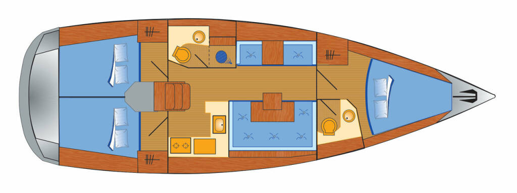 Platforma za kupanje s teleskopskim ljestvama, Harken vitla, dvostruki backstay, CD radio s 2 zvučnika u salonu i kokpitu, sklopivi stol u kokpitu s osvjetljenjem i 12V utičnicom, 12V utičnica u svim kabinama